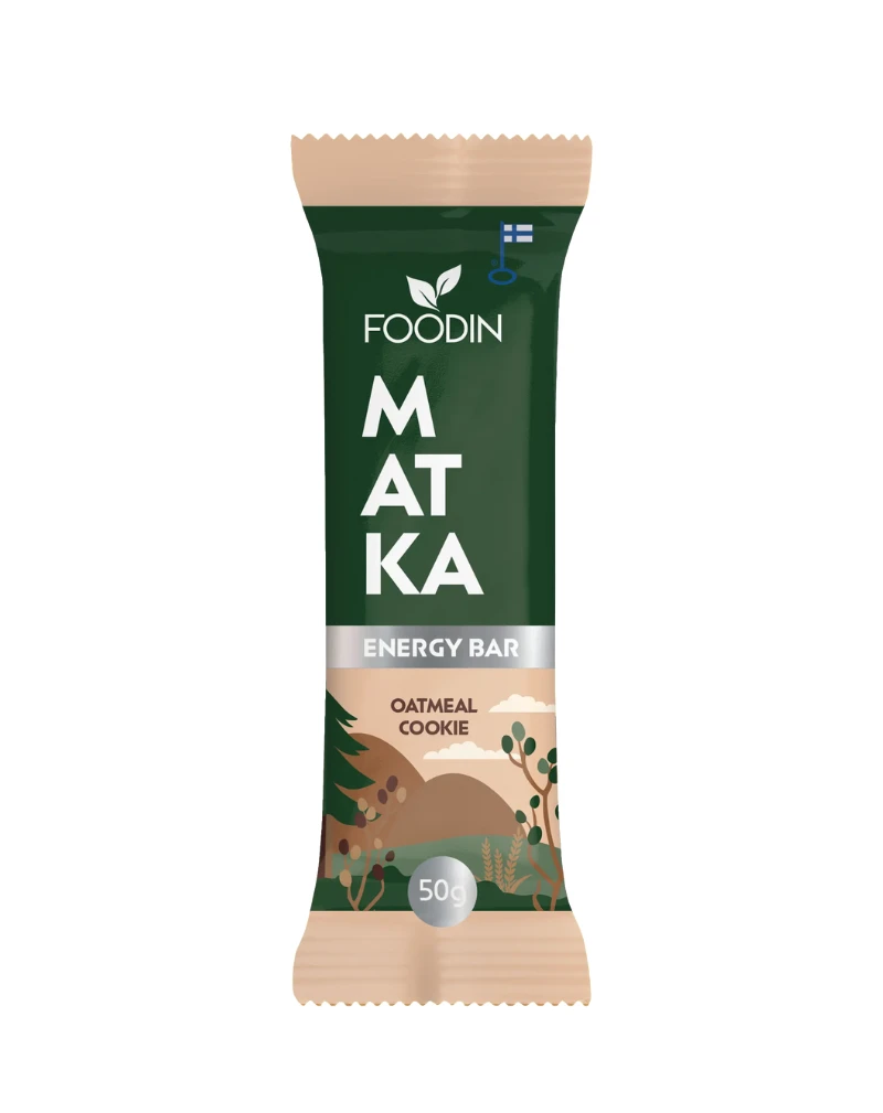 Foodin MATKA Energy Bar on kaura- ja pähkinäpohjainen välipala, joka tarjoaa pitkäkestoista energiaa aktiiviseen arkeen, treeneihin ja ulkoiluun. Suomalainen gluteeniton puhdaskaura ja rapeat pähkinät muodostavat ravinteikkaan pohjan, jota täydentävät huolella valitut luonnolliset raaka-aineet. Jokainen patukka on suunniteltu tasapainoiseksi kokonaisuudeksi, jossa yhdistyvät hiilihydraatit, rasvat ja proteiini – ilman valkoista sokeria, palmuöljyä tai lisäaineita.
